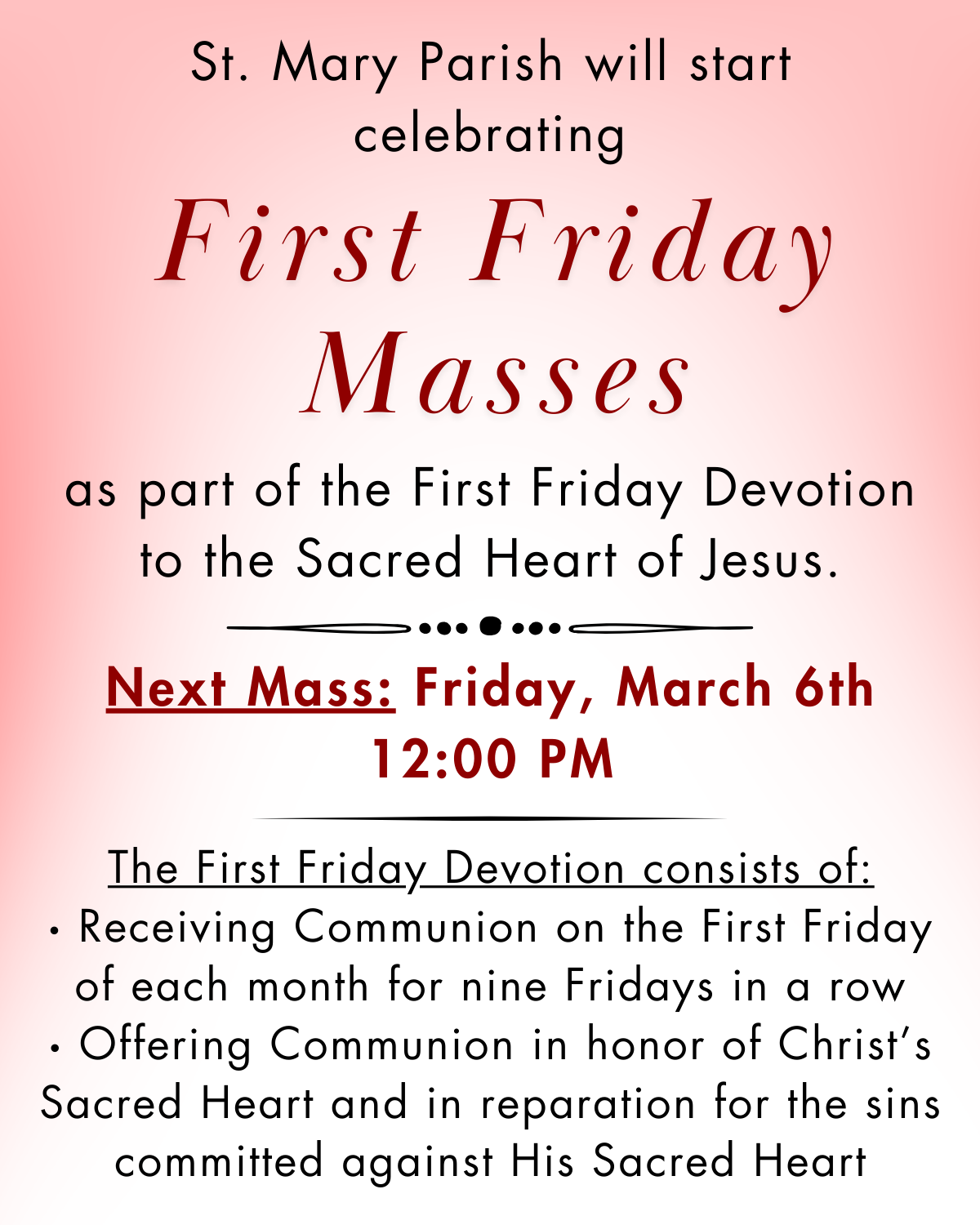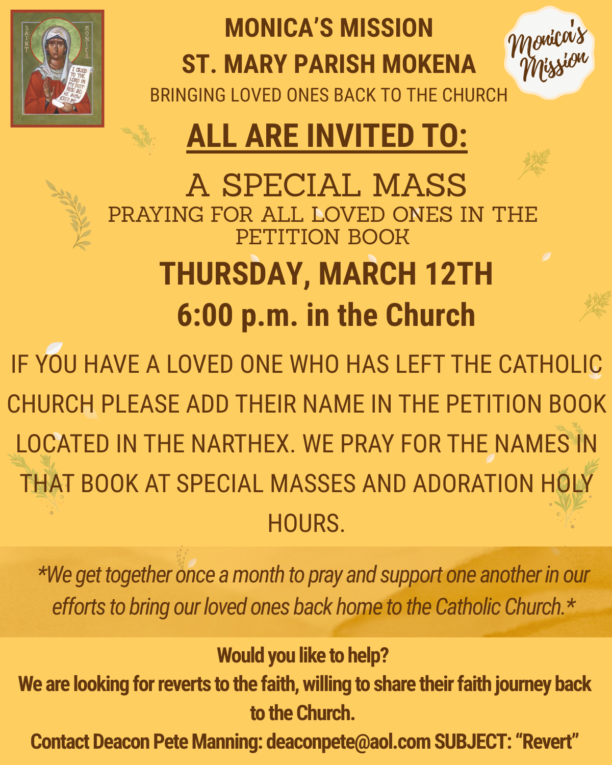 We invite you to become part of the St. Mary, Mokena community.